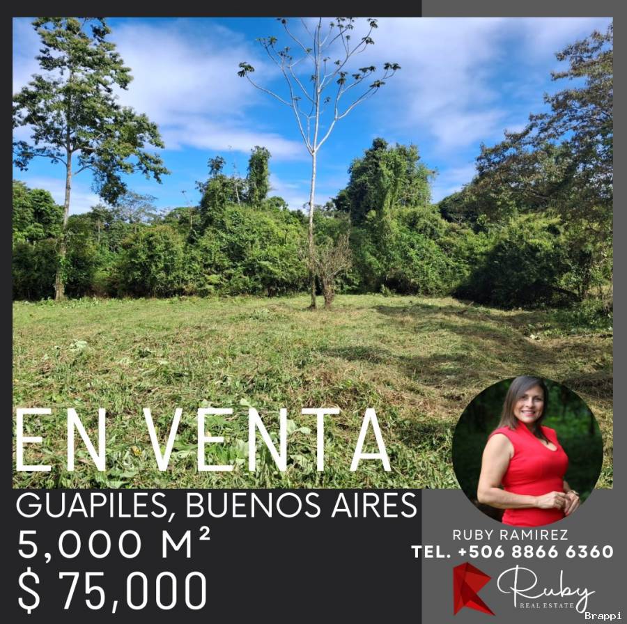 Se venden dos hermosos terrenos, cada uno de 5,000 m², ubicados en la tranquila y cotizada zona de Buenos Aires de Guápiles. A tan solo 40 metros de la calle principal, lo que brinda fácil acceso sin perder la privacidad y tranquilidad del entorno.