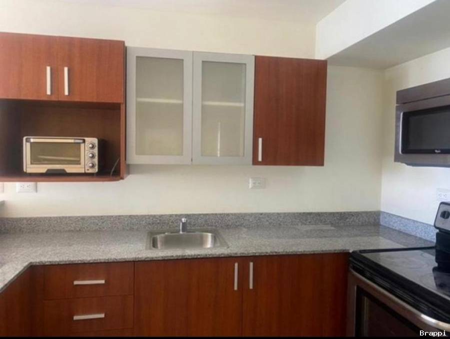 Apartamento de 78m 2 con una habitación, 1 baño, una larga sala. Amueblado con: Lavadora/Secadora, refrigeradora, cocina, microondas/extractor, hornito convencional en acero inoxidable. Incluye cuota de mantenimiento y agua. Incluye parqueo.